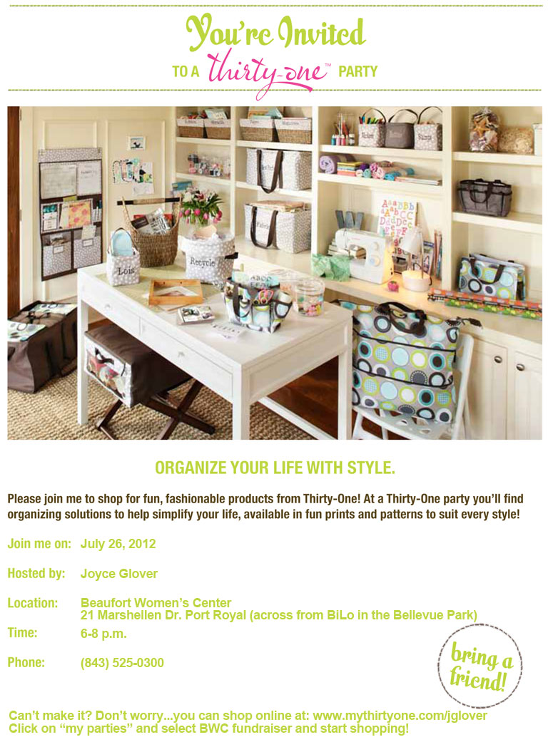 The Beaufort Women’s Center (a Christian ministry serving women facing an unplanned pregnancy) is the beneficiary of the majority of the profits from a Thirty-One party being hosted at the center by Joyce Glover on July 26. We could really use a good turnout and this is a great way to get a head start on Christmas shopping while helping a great cause. Thanks.