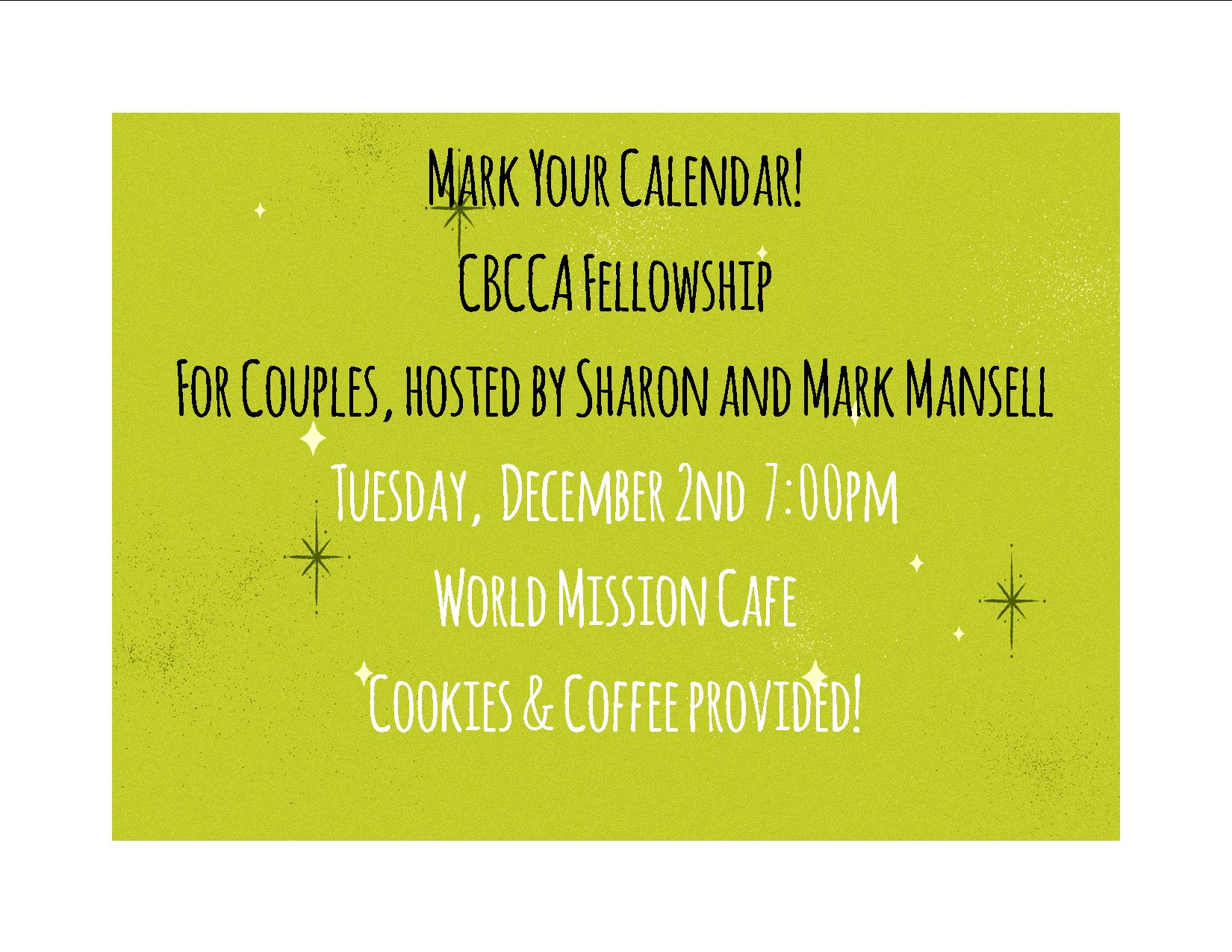 11/11  6:30-7:00 Fellowship, 7:00-8:00 Topic: CBCCA Yearbook