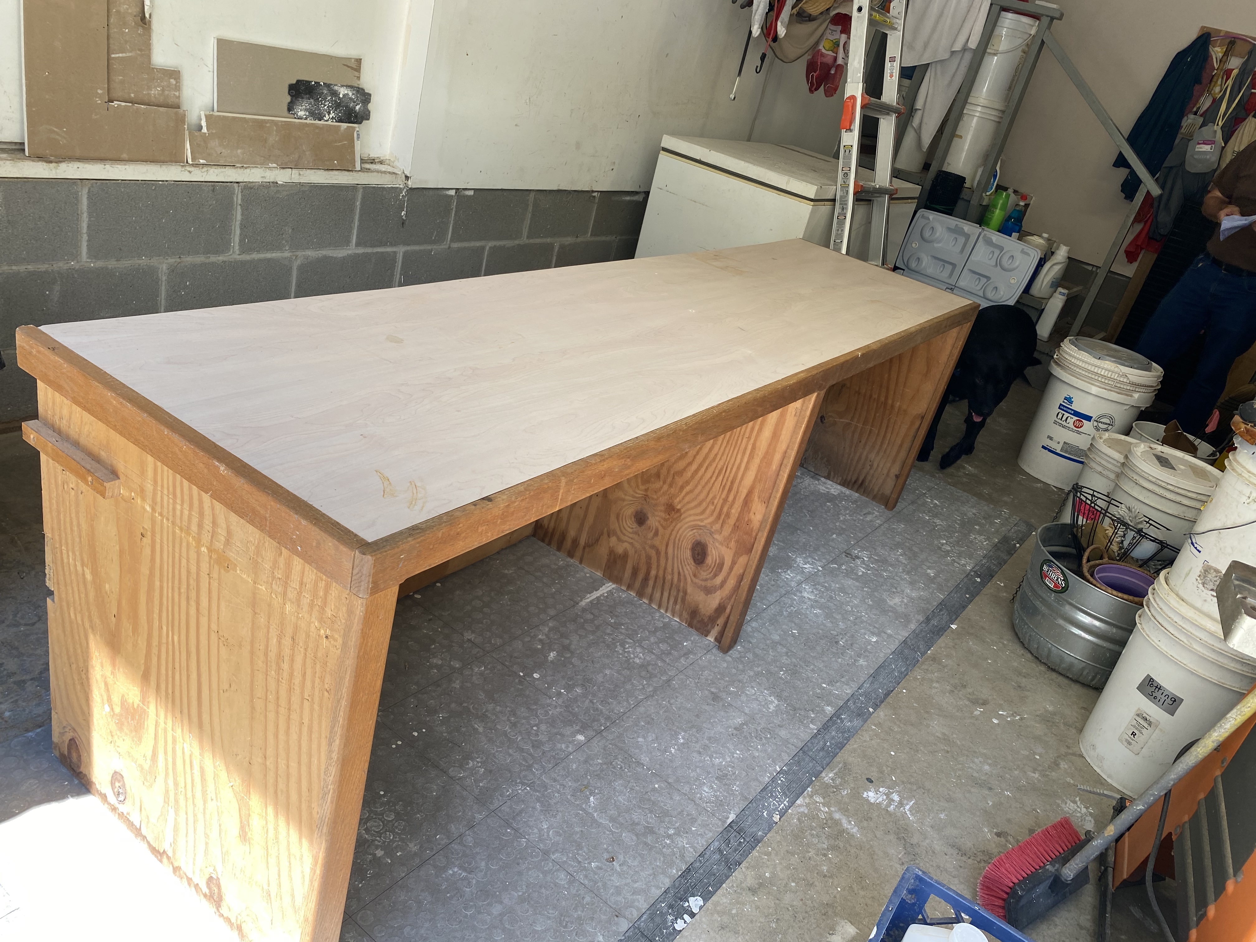 We homeschooled our children using this desk. It is a plywood table with formica top and oak trim.