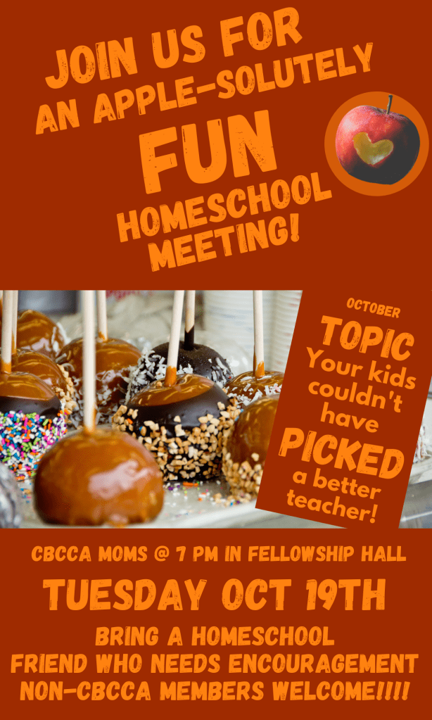 We will decorate caramel apples and then talk about how the Lord has chosen YOU to be your child’s mom and will help you to be equipped as you walk with Him as you homeschool!
