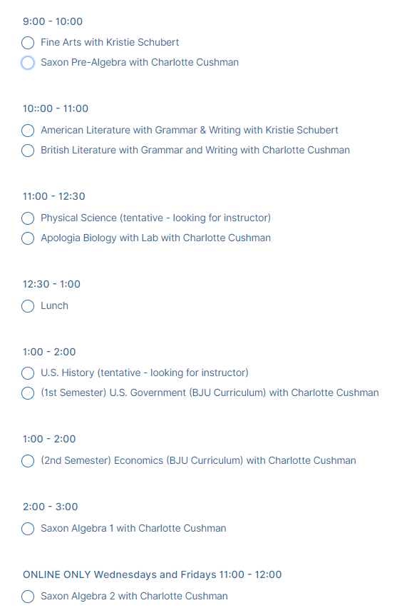 Our ministry seeks to come alongside local homeschool families to help them homeschool through high school. Classes are Tuesdays and Thursdays from 9:00 am until 3:00 pm. They do not require a parent to stay on campus. Classes are available to local homeschool students and may be taken a la carte. There is a lab fee of $25 per student per semester. Total fee per family no more than $50 per semester.