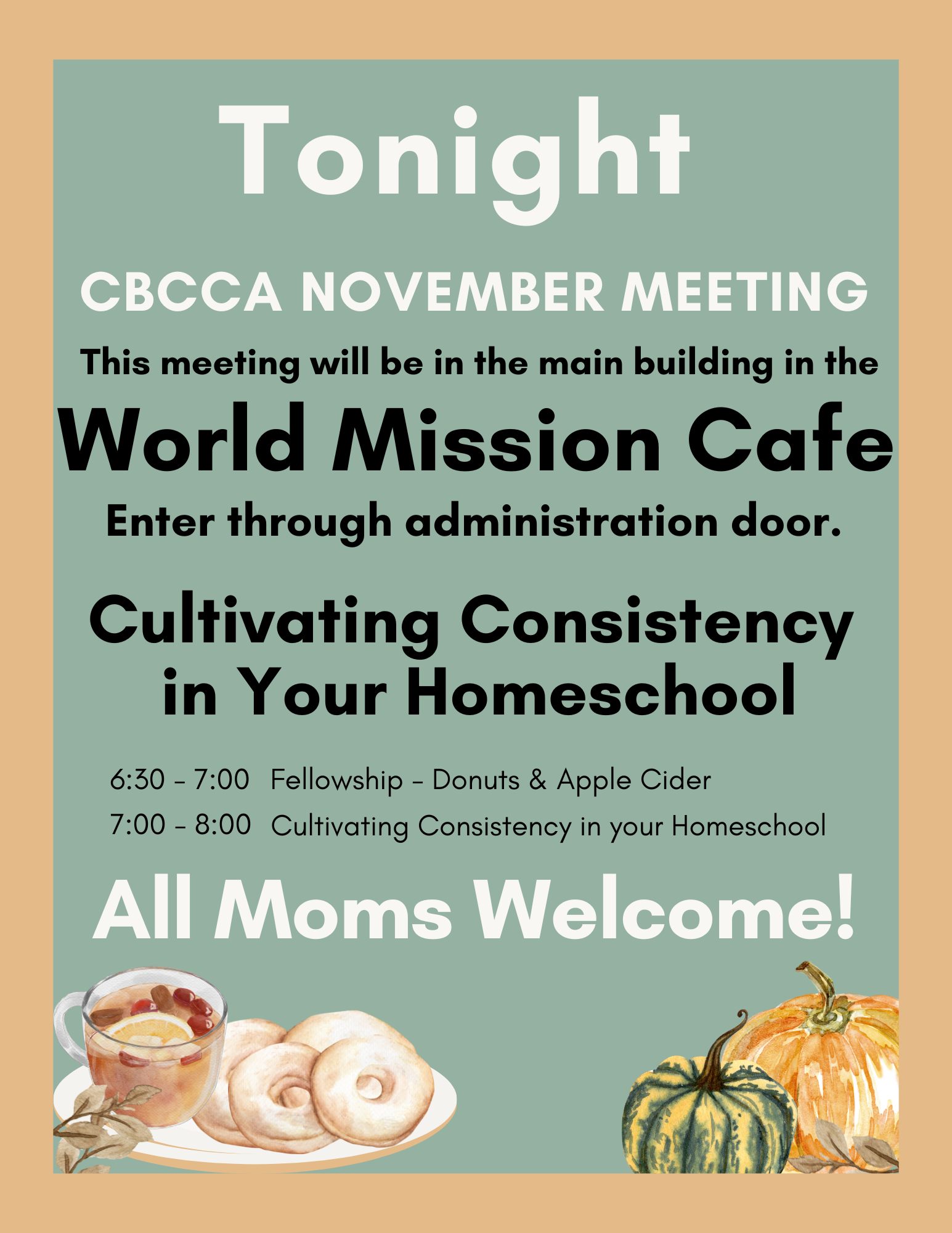 11/11  6:30-7:00 Fellowship, 7:00-8:00 Topic: CBCCA Yearbook