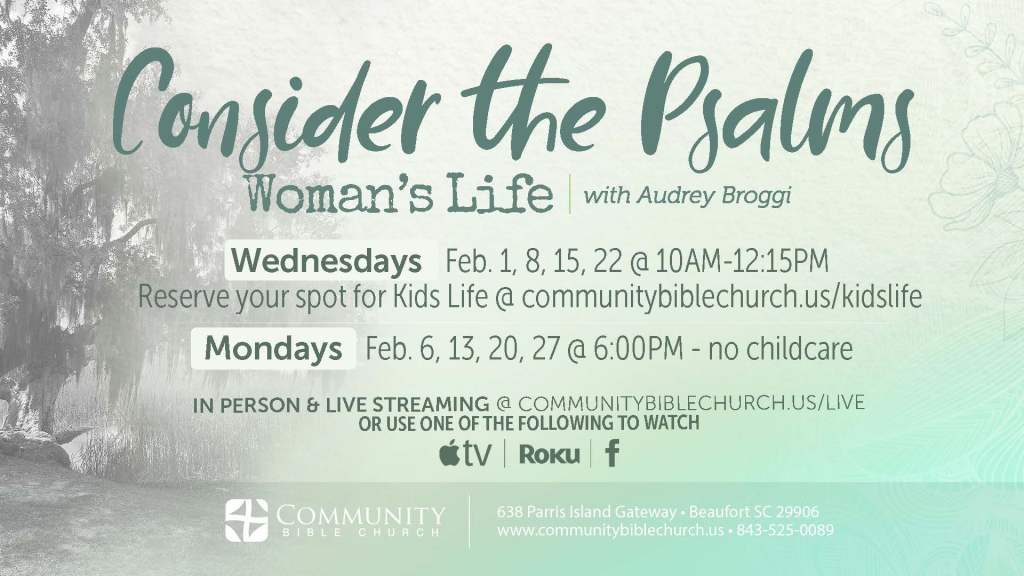 Looking forward to another great month of studying the Psalms beginning Feb 1st for the day session with Kids Life and Feb 6th for the evening session! Please note that if you are planning to attend with your children on Wednesday mornings you must reserve a spot for them. You can do so here: http://www.communitybiblechurch.us/kidslife