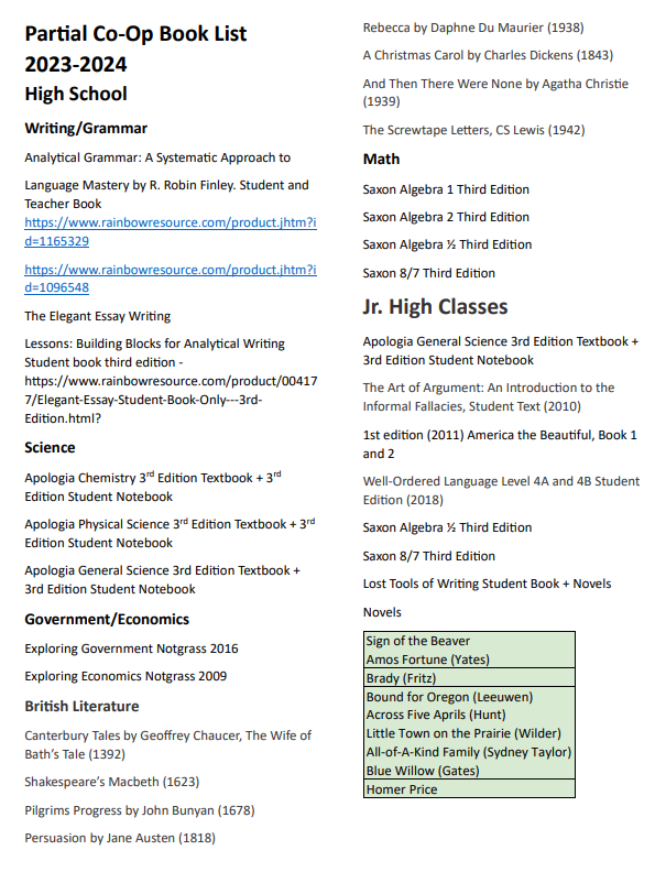 Co-Op Members – You do not need to purchase everything on this list – only things applicable to the classes your student is taking.