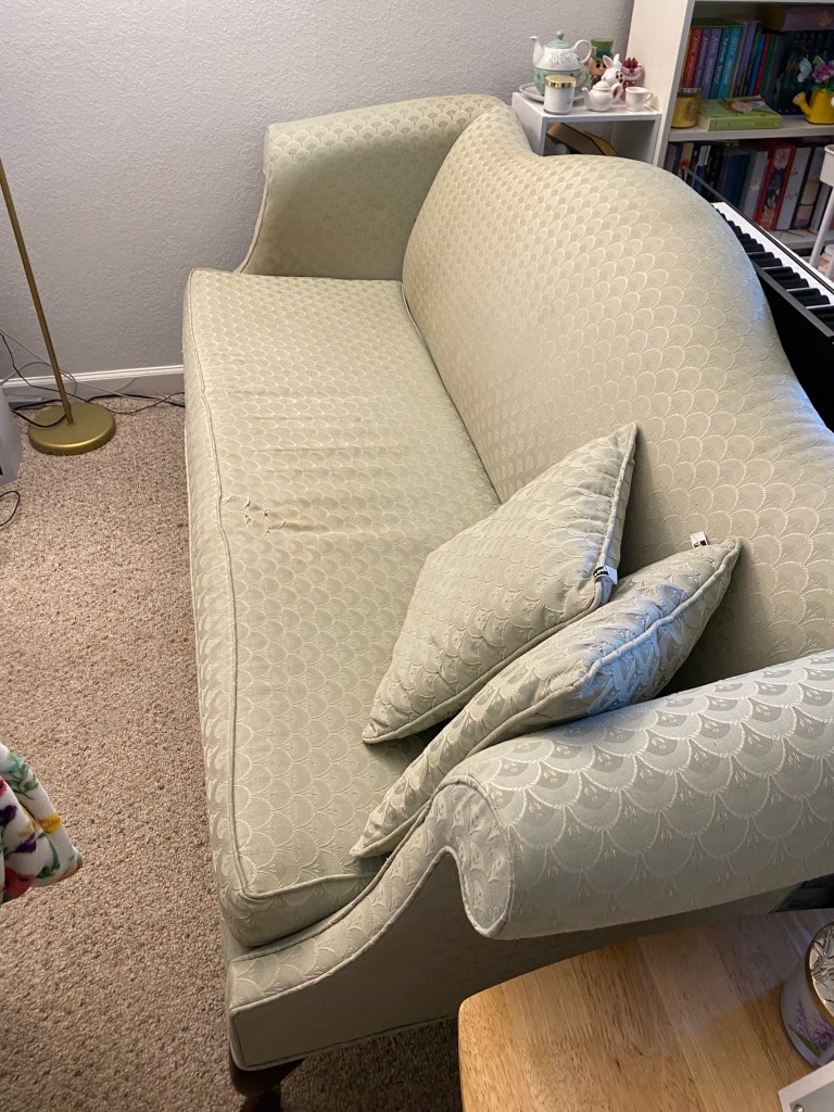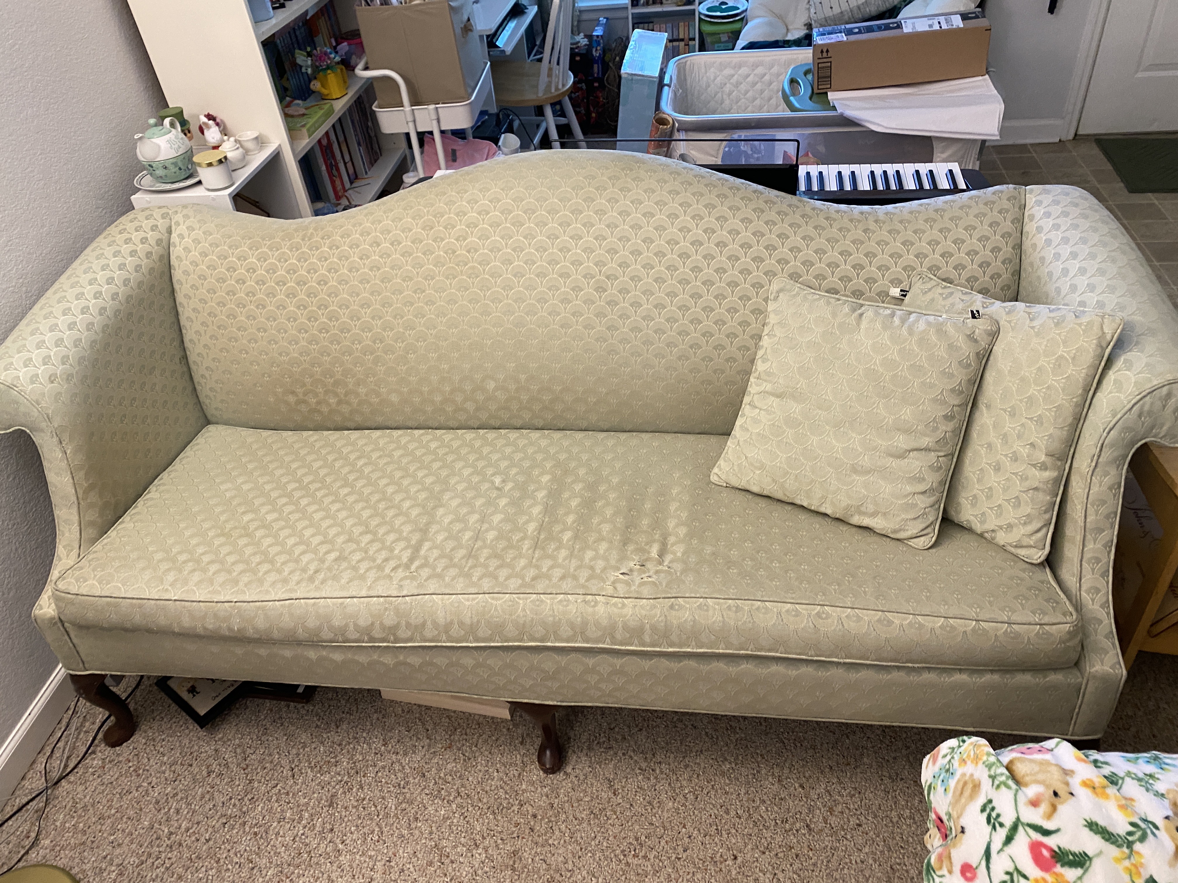 Light green, Victorian style couch for free. Pickup in Bluffton off Fording Island Road. Includes two pillows shown in photos. It’s not super heavy but will need two people to pickup if my husband isn’t home. Roughly 80”x36”x32”.