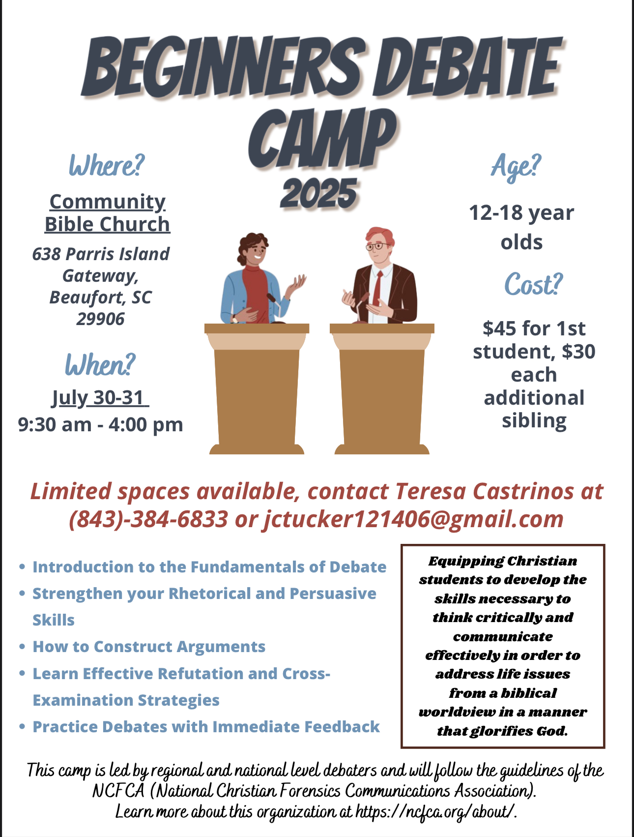 10/14 6:30-7:00 Fellowship, 7:00-8:00 Topic: Trail Life, American Heritage Girls and the Debate Club will present.