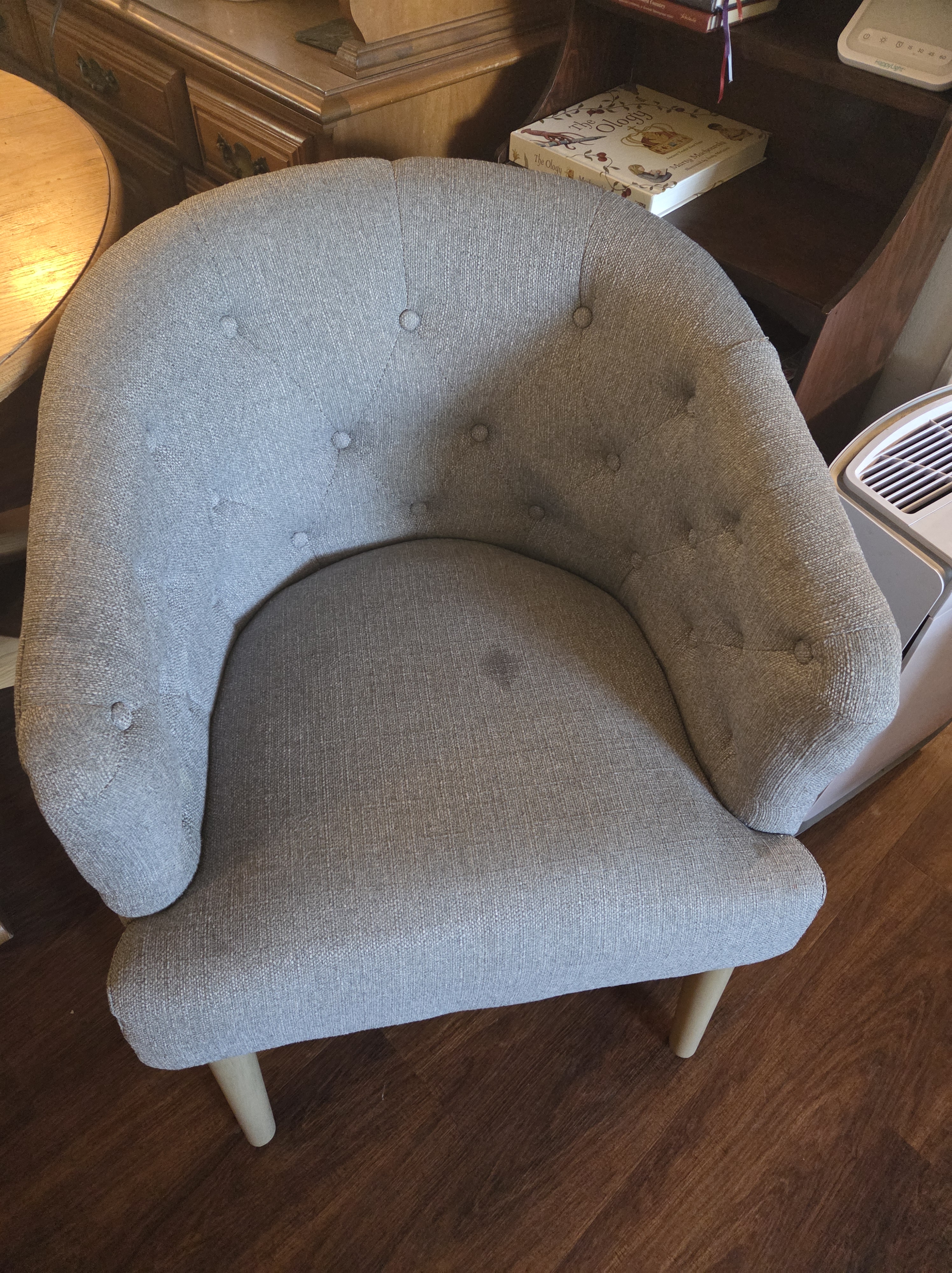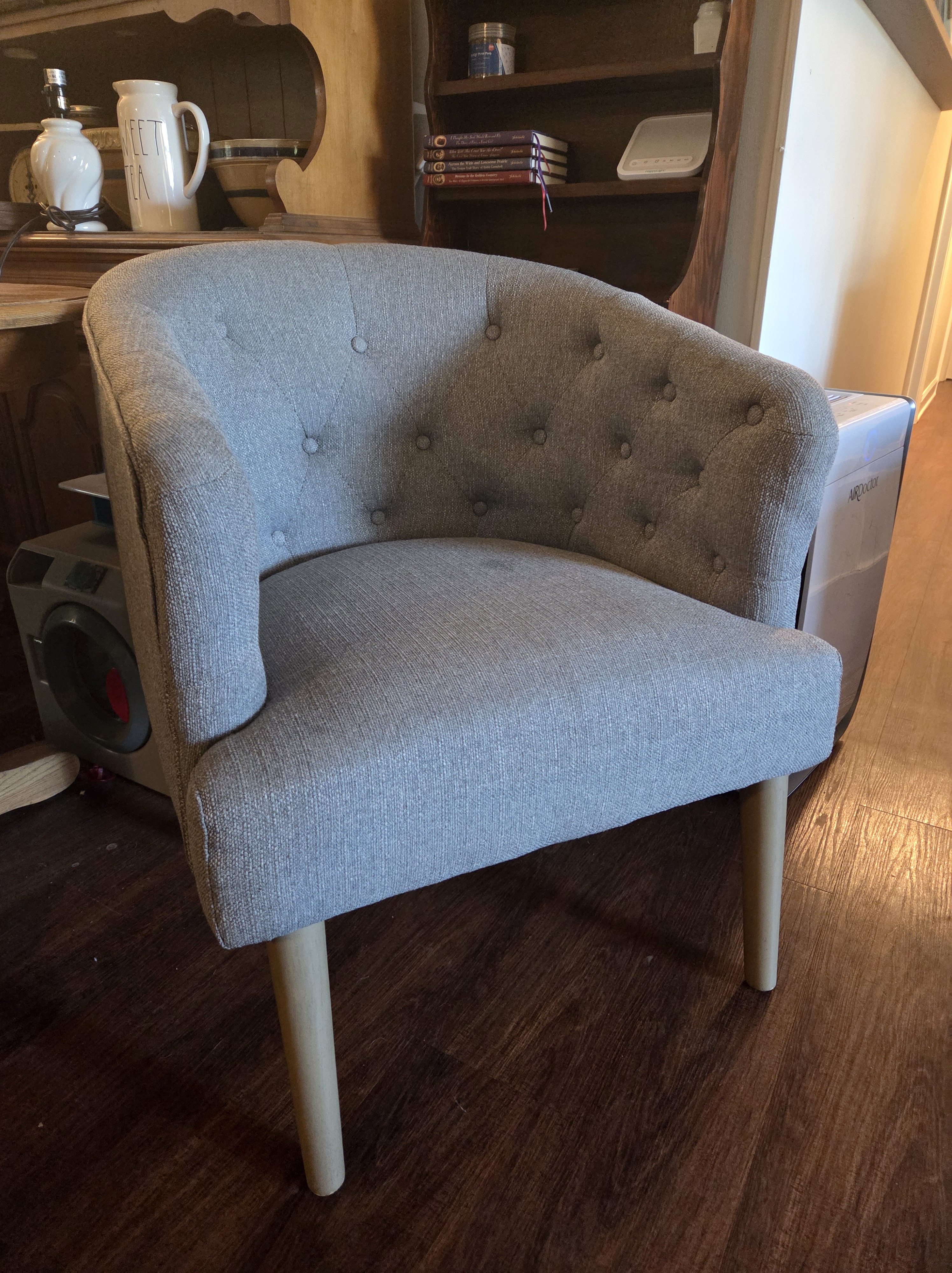 Grey accent barrel chair for sale $25. It does have a stain on the seat which may be washable (haven’t tried getting it out honestly) please text Anna Klausman at 843-473-0584 thanks!