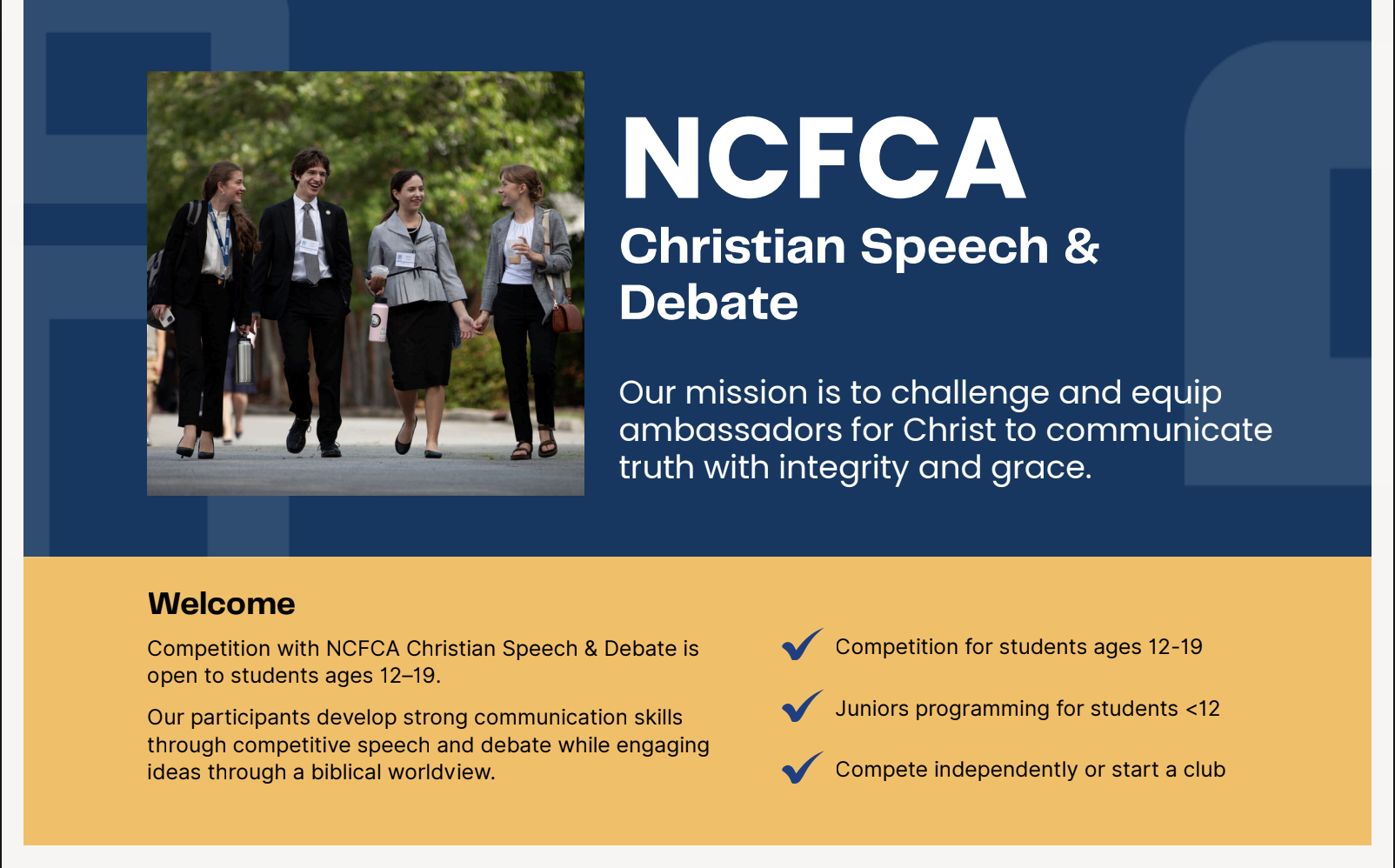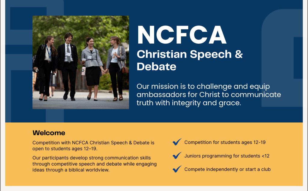 10/14 6:30-7:00 Fellowship, 7:00-8:00 Topic: Trail Life, American Heritage Girls and the Debate Club will present.