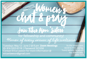Tonight! Women’s Titus 2 fellowship meets again at 8 pm and wraps ups between 8:45 and 9.