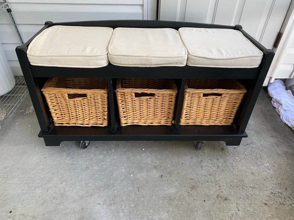 Bench with cubbies. 40” wide by 15” deep. Cushions definitely need to be recovered, I suppose you could use without the cushions. $25.00 Also 27” x 12’ long runner. $20.00. Text Claudia 843-812-2864.