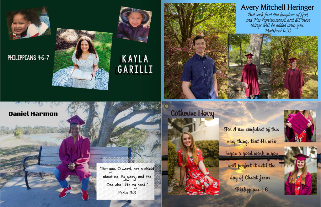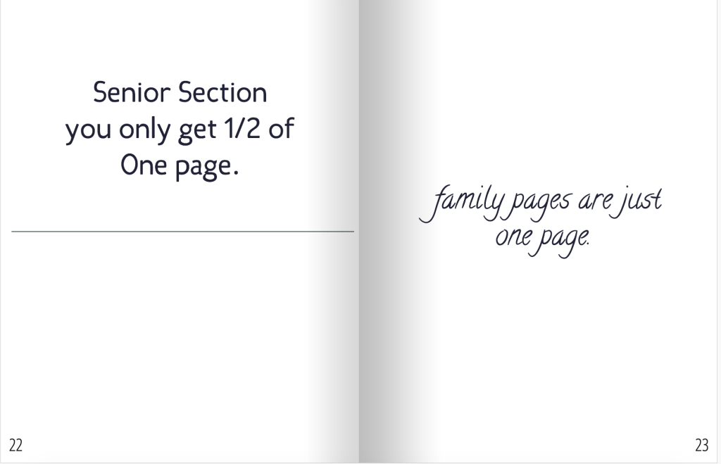 Your senior section will be designed on 1/2 of one page. (just 1/4 of the 2 page spread) this is so we can get 4 seniors on 2 pages.